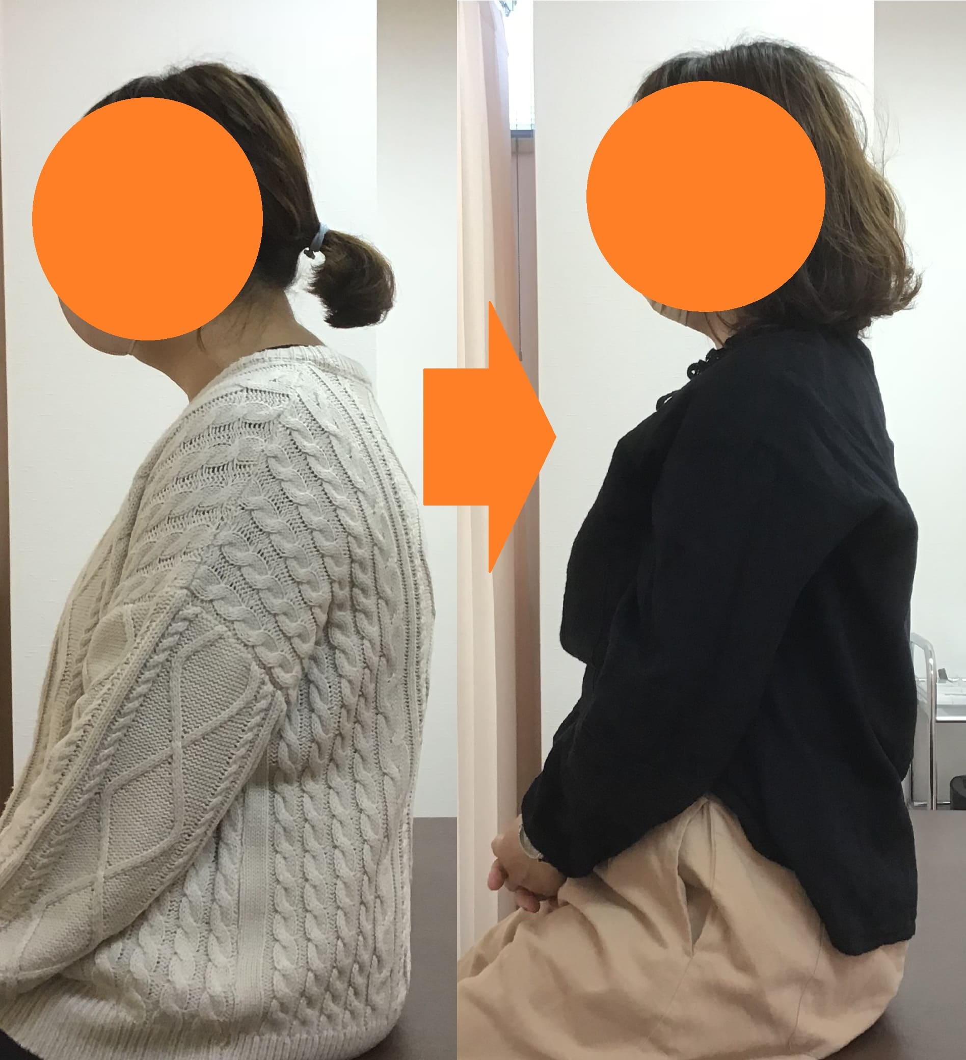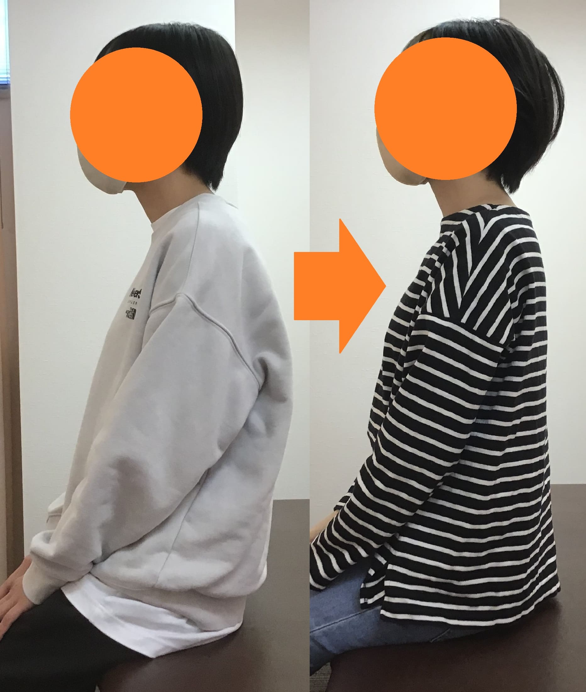 初回の猫背矯正を受けた後、姿勢の改善により首の痛みがある程度改善されました。しかし、その時点では完全に痛みがなくなったわけではありませんでしたので、週1回の頻度で矯正を続けることとなりました。3ヶ月後、継続した矯正の効果によりストレートネックが改善され、首の痛みも完全に消失しました。また、肩こりも感じなくなり、患者様にとって非常に満足のいく結果となりました。これにより、猫背矯正を終了としました。