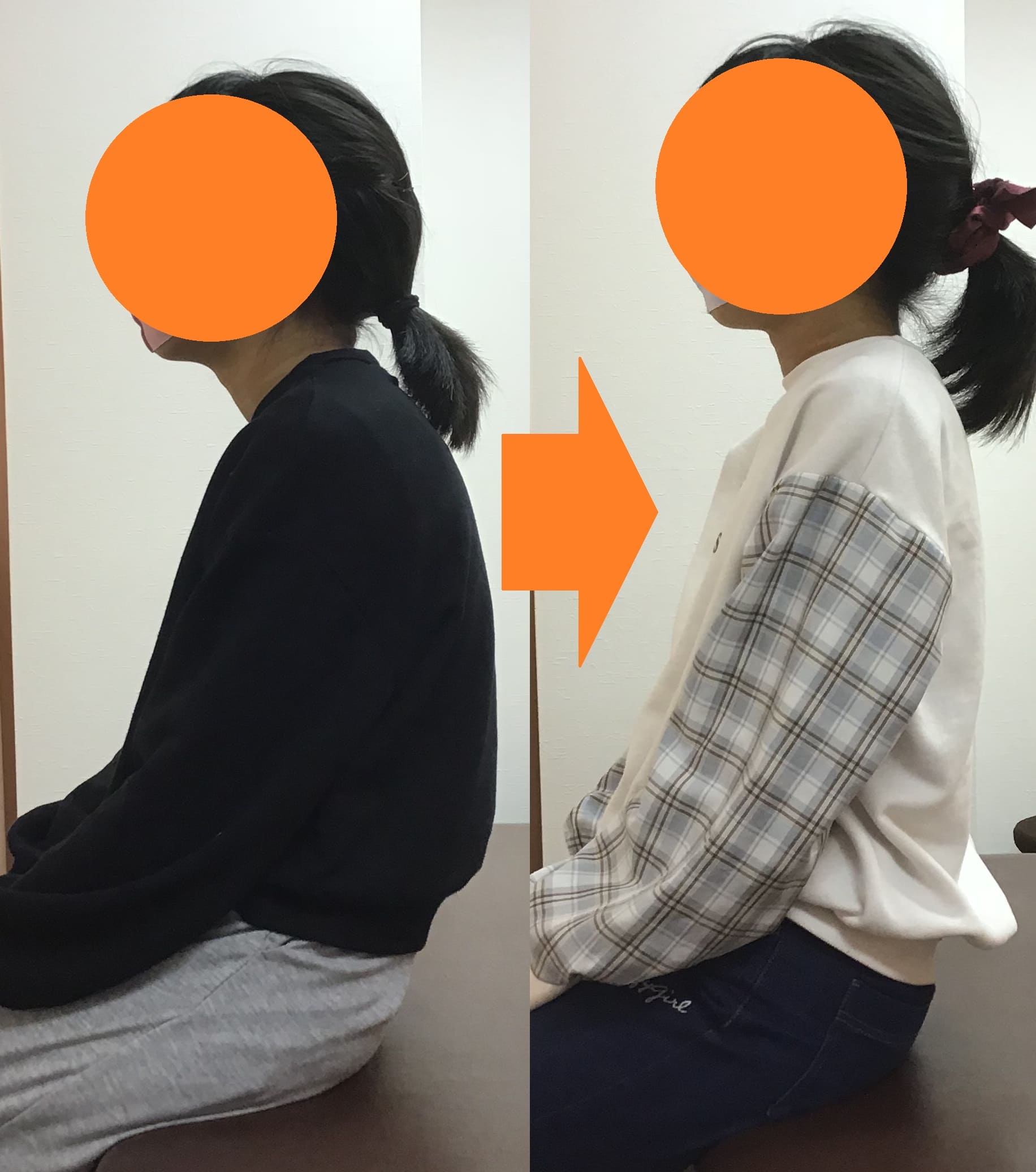 初回の施術後、姿勢に改善が見られ、首の痛みも和らぎました。ただし、完全に痛みを取り除くには至らなかったため、週に一度の頻度でキッズ猫背を継続しました。その後、徐々に正しい姿勢が自然になり、施術開始から3か月が経過した際には、スマホ首が改善しました。首の痛みも感じなくなり、また従来の肩こりの感覚も薄れてきたことで、キッズ猫背を終了としました。
