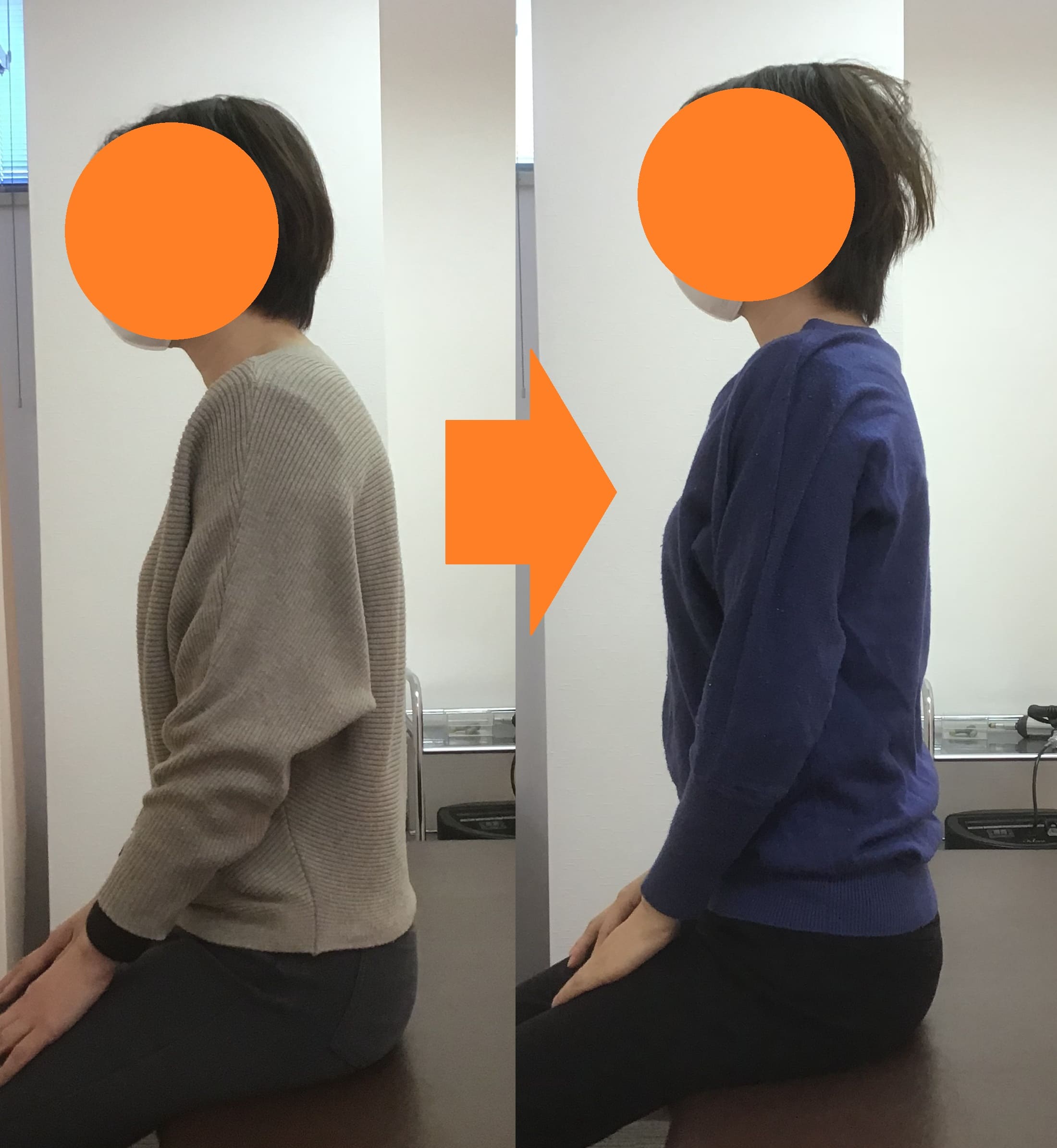 初回の猫背矯正施術後には姿勢に改善が見られたものの、まだ首痛とストレートネックは残っていました。そのため週一回の猫背矯正を3ヶ月間継続し、ついにストレートネックが改善、首の痛みも消失しました。患者様も「肩こりを感じなくなった」と喜ばれており、無事矯正を終了としました。